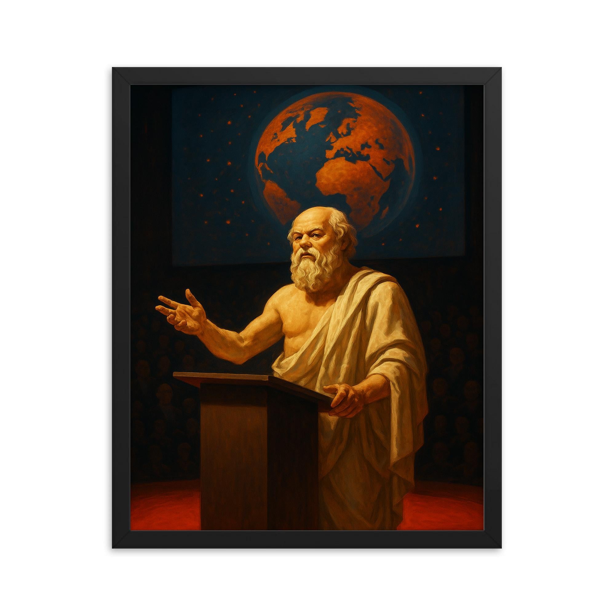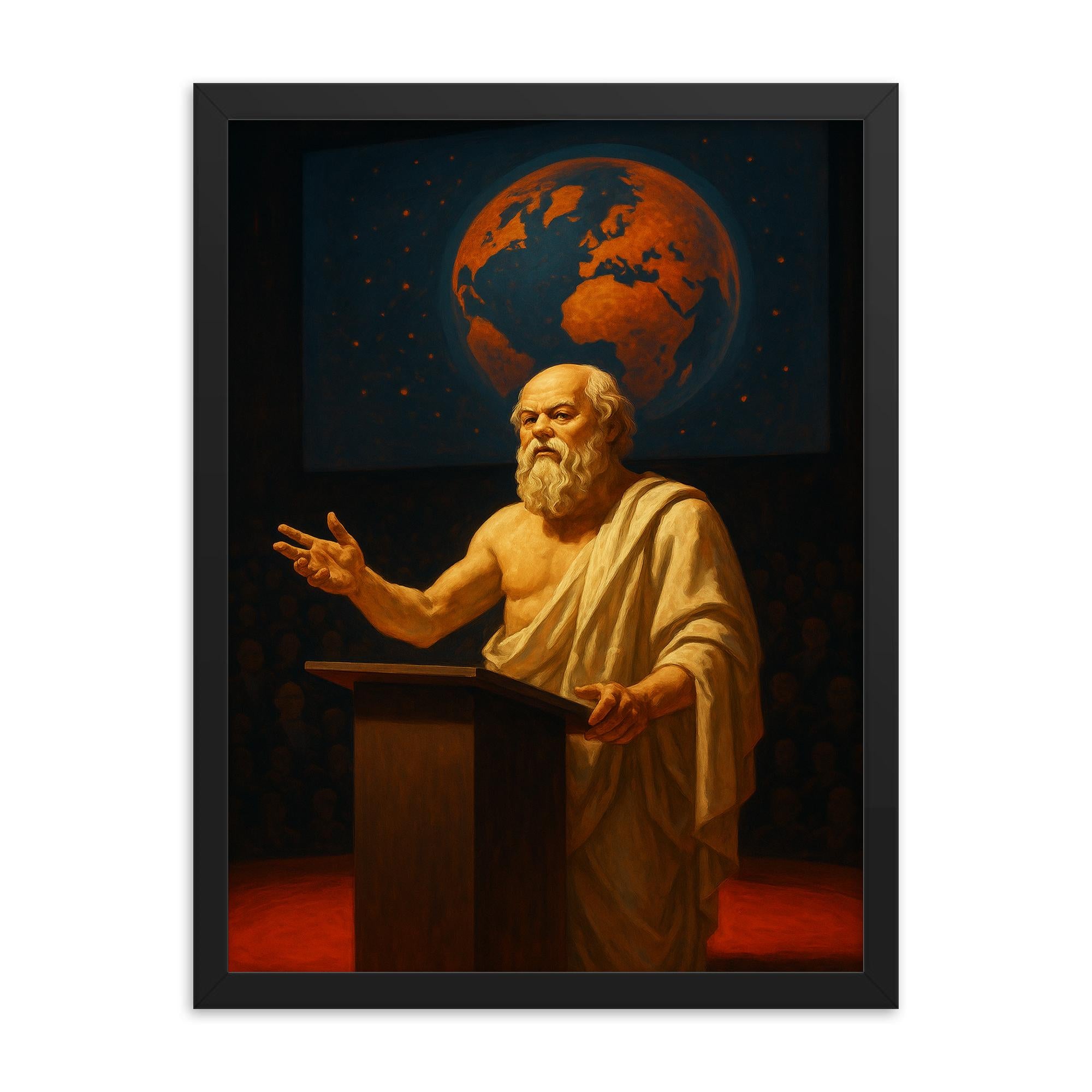 Elevate your space with a truly timeless piece of wall art: Socrates delivering a TED style lecture—captured as a stunning framed print that bridges the wisdom of ancient philosophy with modern-day inspiration.