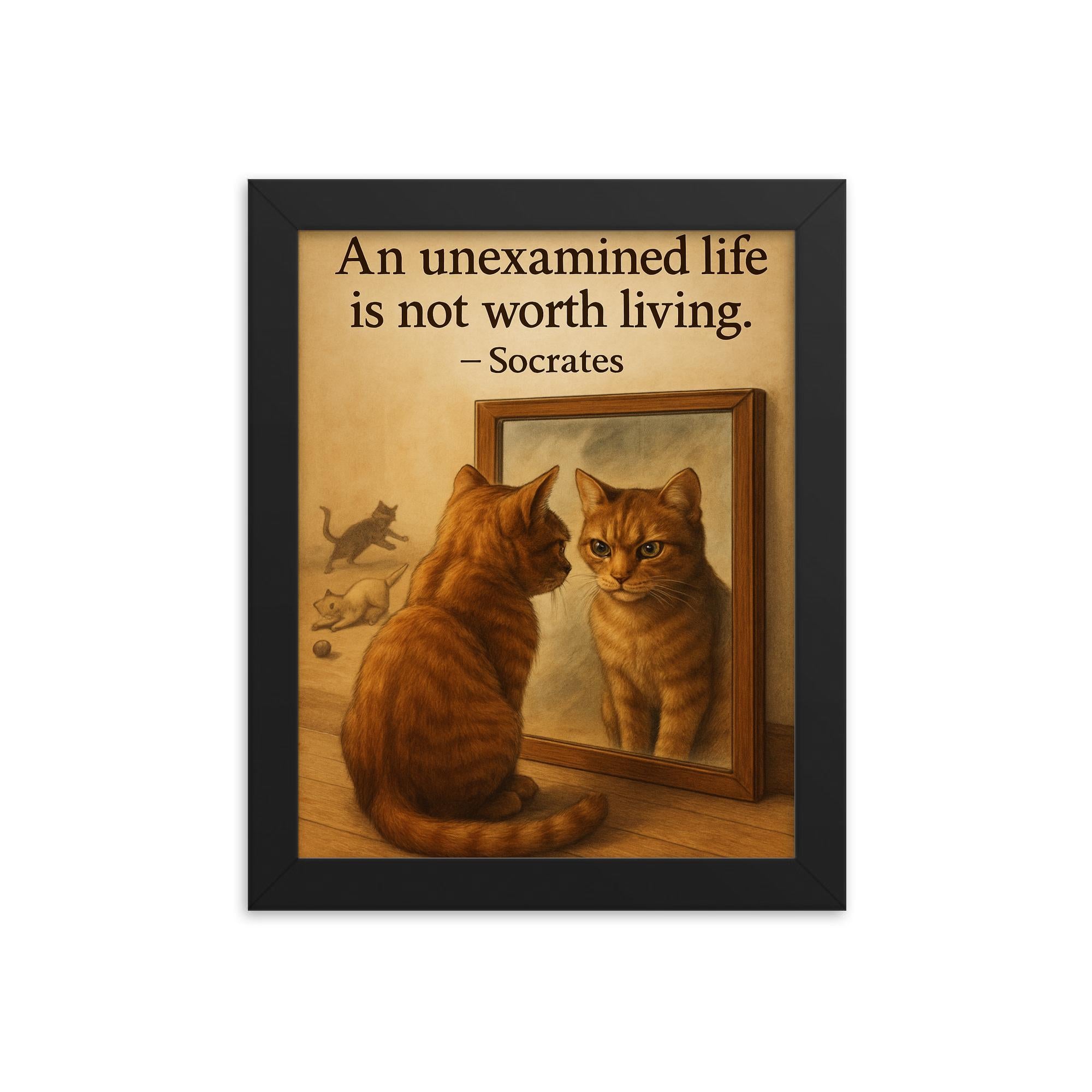Elevate your walls—bring home wisdom, charm, and a dash of feline philosophy today. Shop now and own a powerful reminder to always examine and truly live your life.
