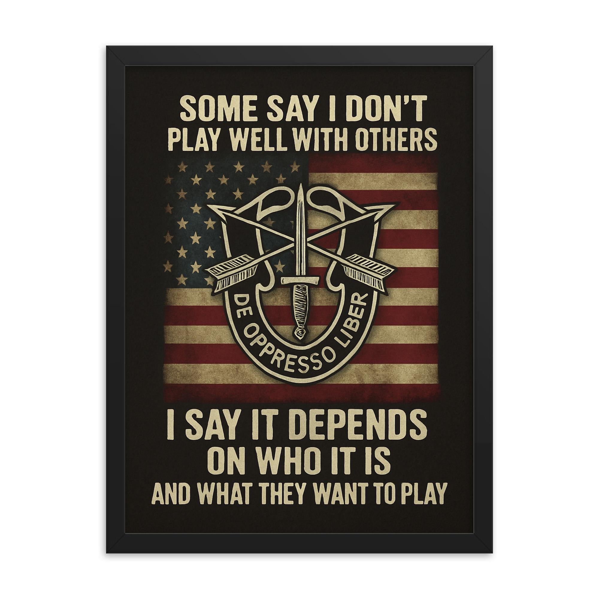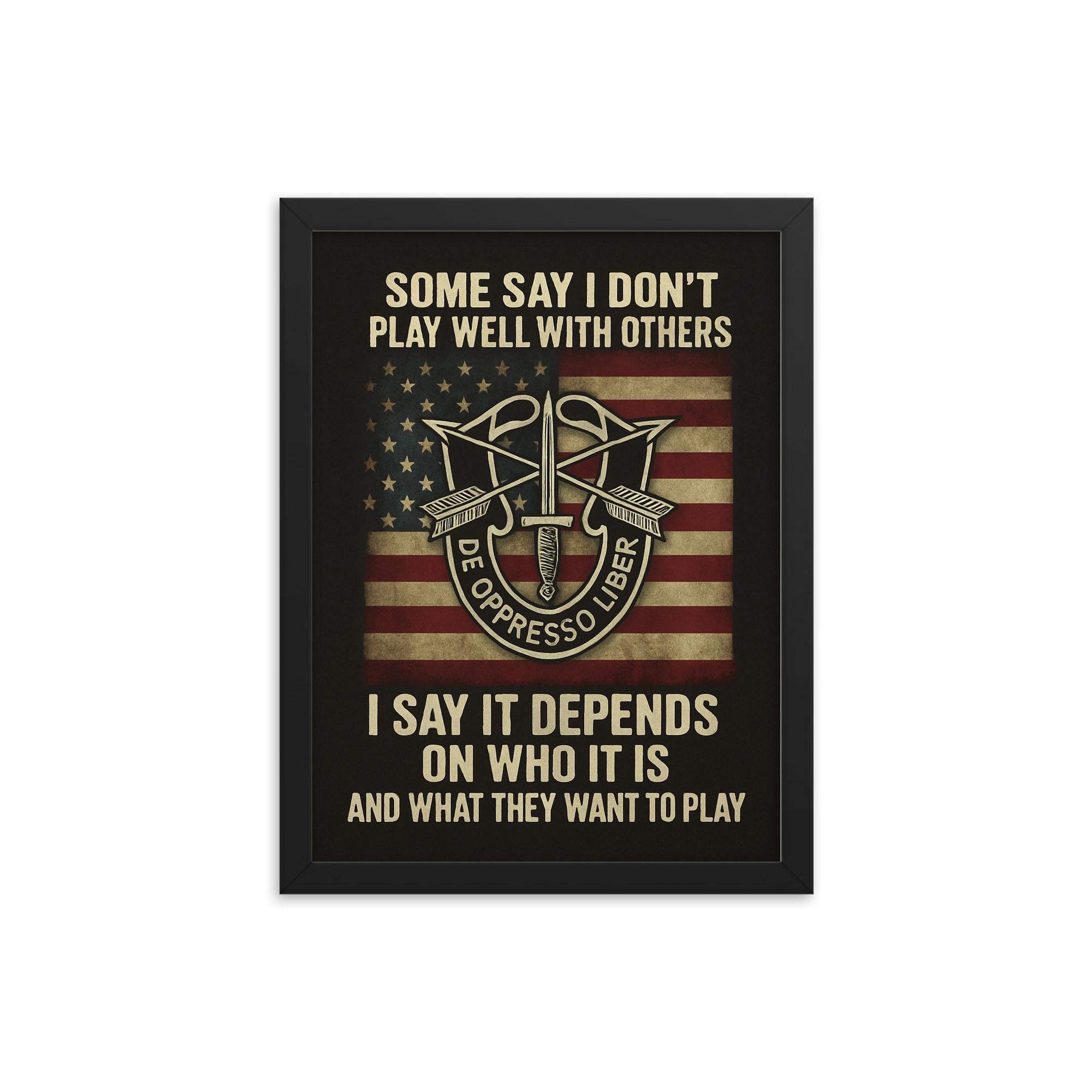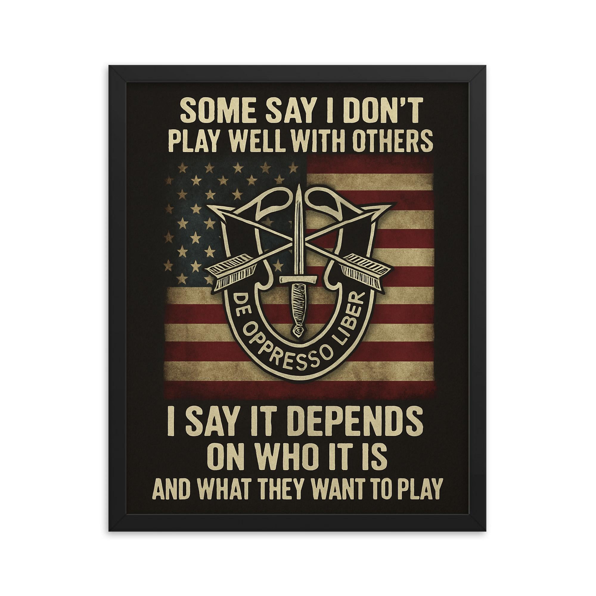 This framed print featuring the "Some say I don't play well with others" US Special Forces quote is more than wall art—it's a declaration.