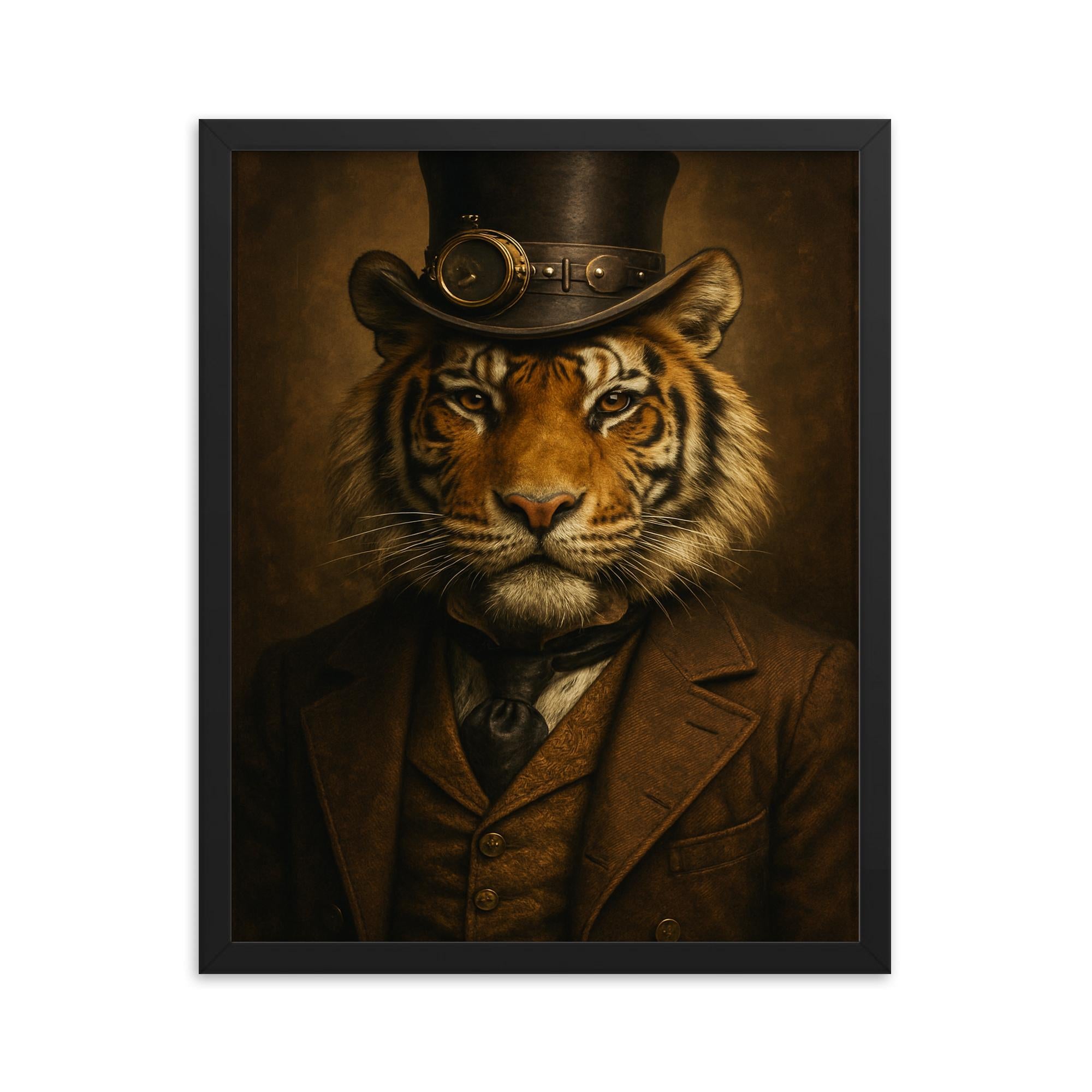 Step into a world where timeless elegance meets bold imagination with this framed print of a steampunk-style portrait featuring a tiger clad in a dapper Victorian suit and top hat.