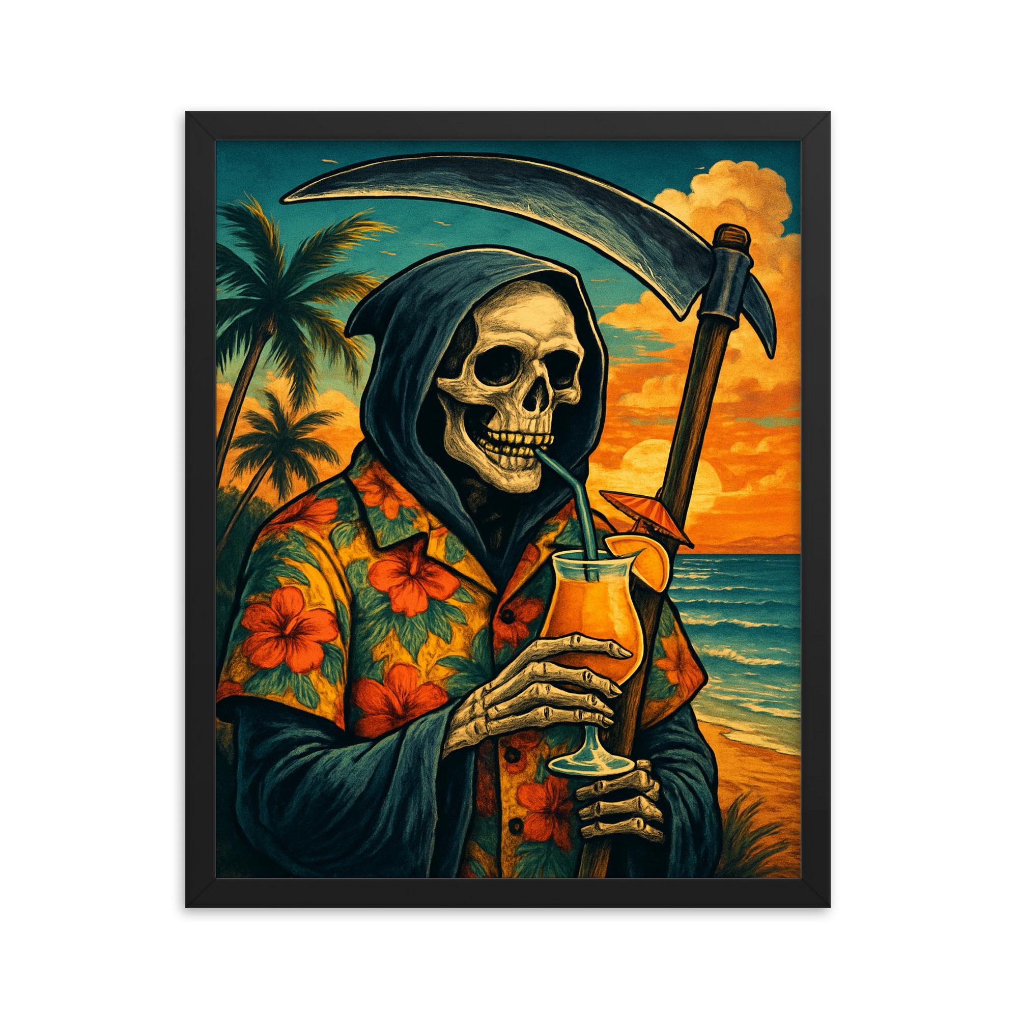 Bring a bold twist to your wall decor with this eye-catching framed print of The Grim Reaper on vacation — casually rocking a Hawaiian shirt and sipping a tropical drink. It’s the perfect blend of dark humor and vibrant island vibes that will spark conversations and add a unique edge to any room.