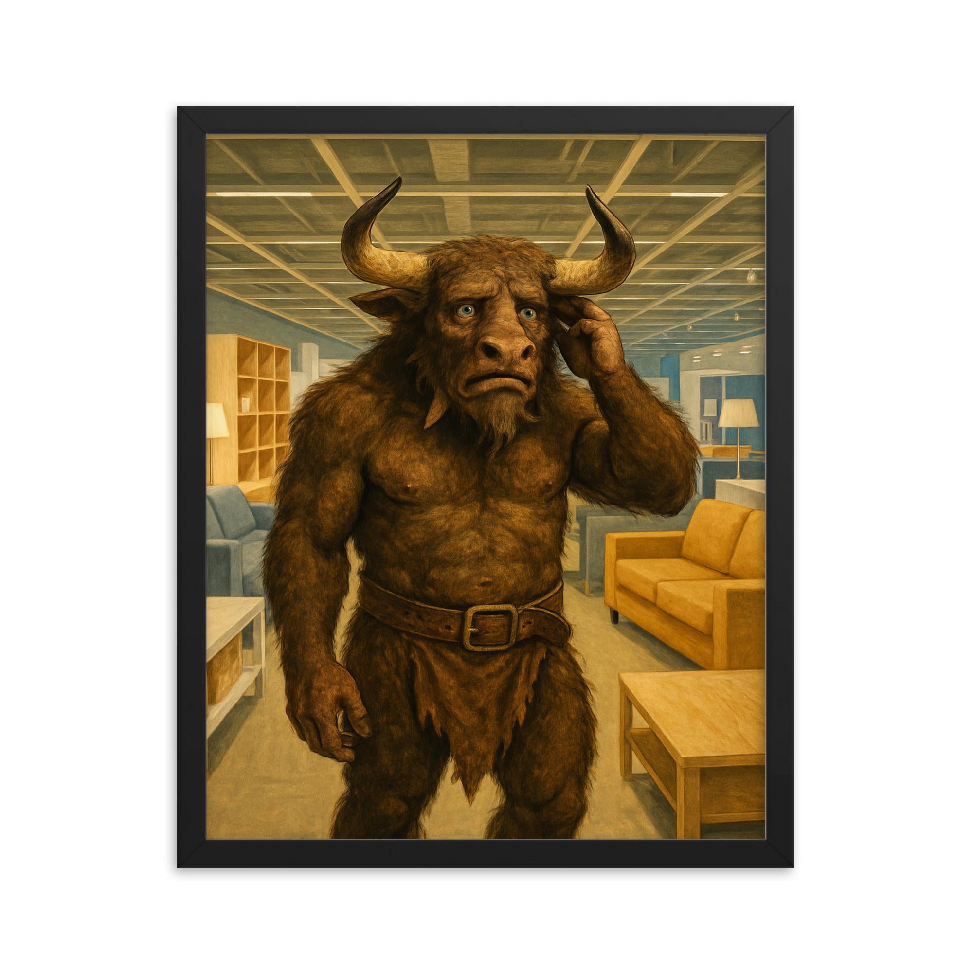 Discover a truly one-of-a-kind piece of wall art that sparks curiosity and conversation: a framed print of the Minotaur looking lost and confused in the aisles of a modern furniture store.