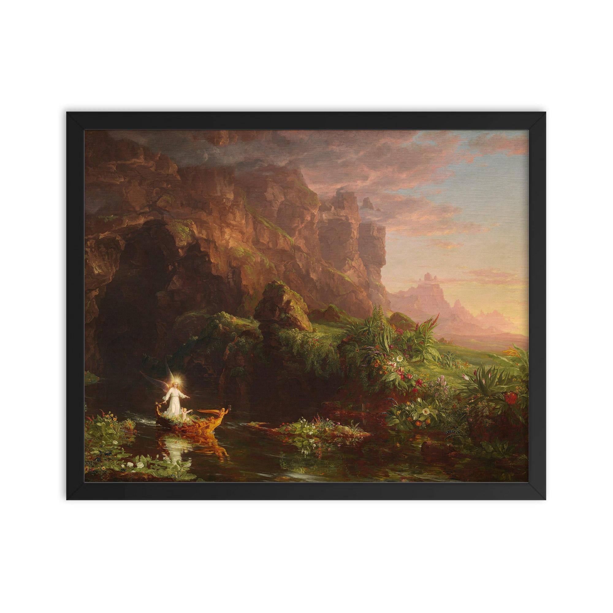Invite the magic of classic American art into your space with this captivating framed print of The Voyage of Life: Childhood, painted by renowned Hudson River School artist Thomas Cole in 1842.