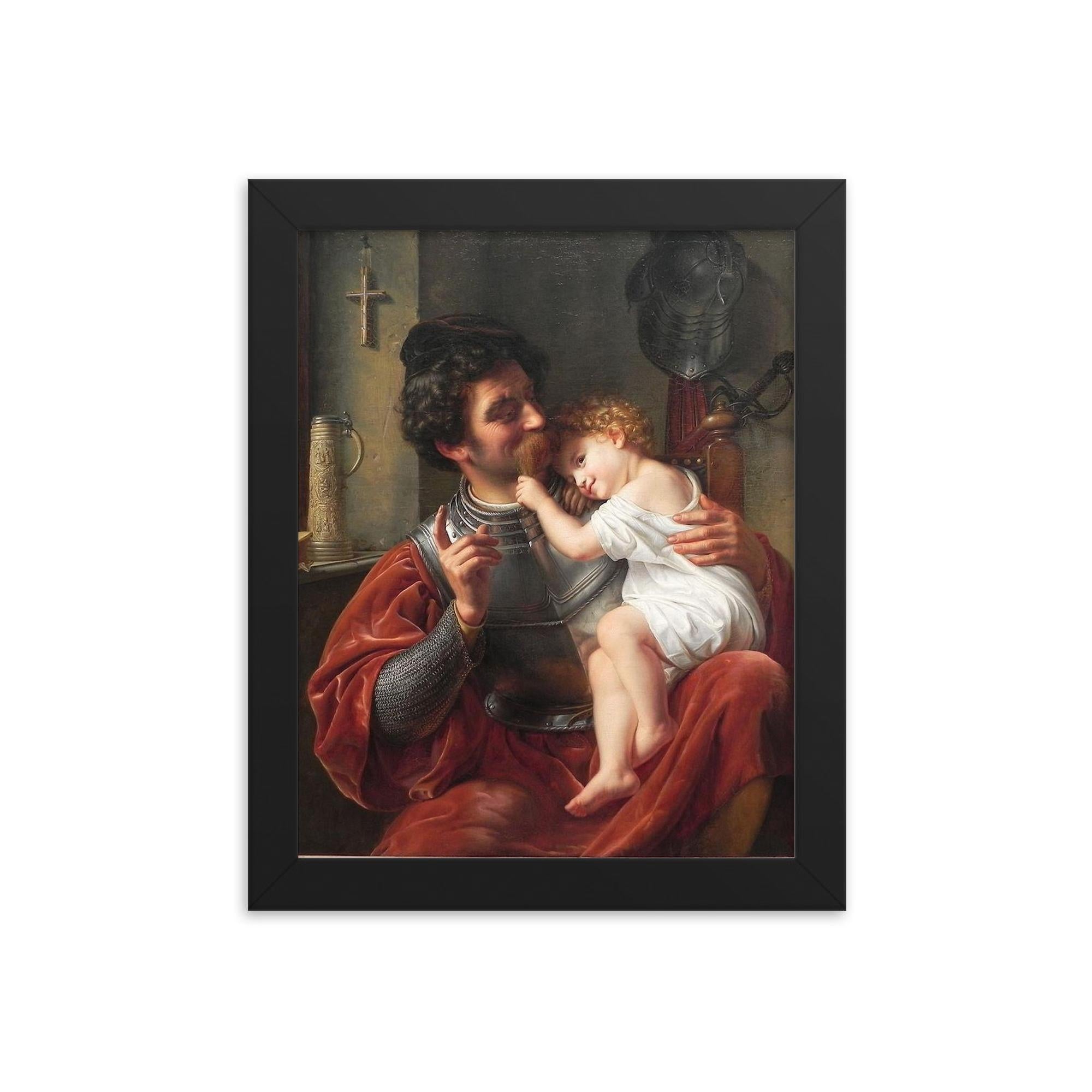 Elevate your living space with a timeless masterpiece: a beautifully framed print of Theodor Hildebrandt’s iconic 1832 artwork, The Warrior and His Child.