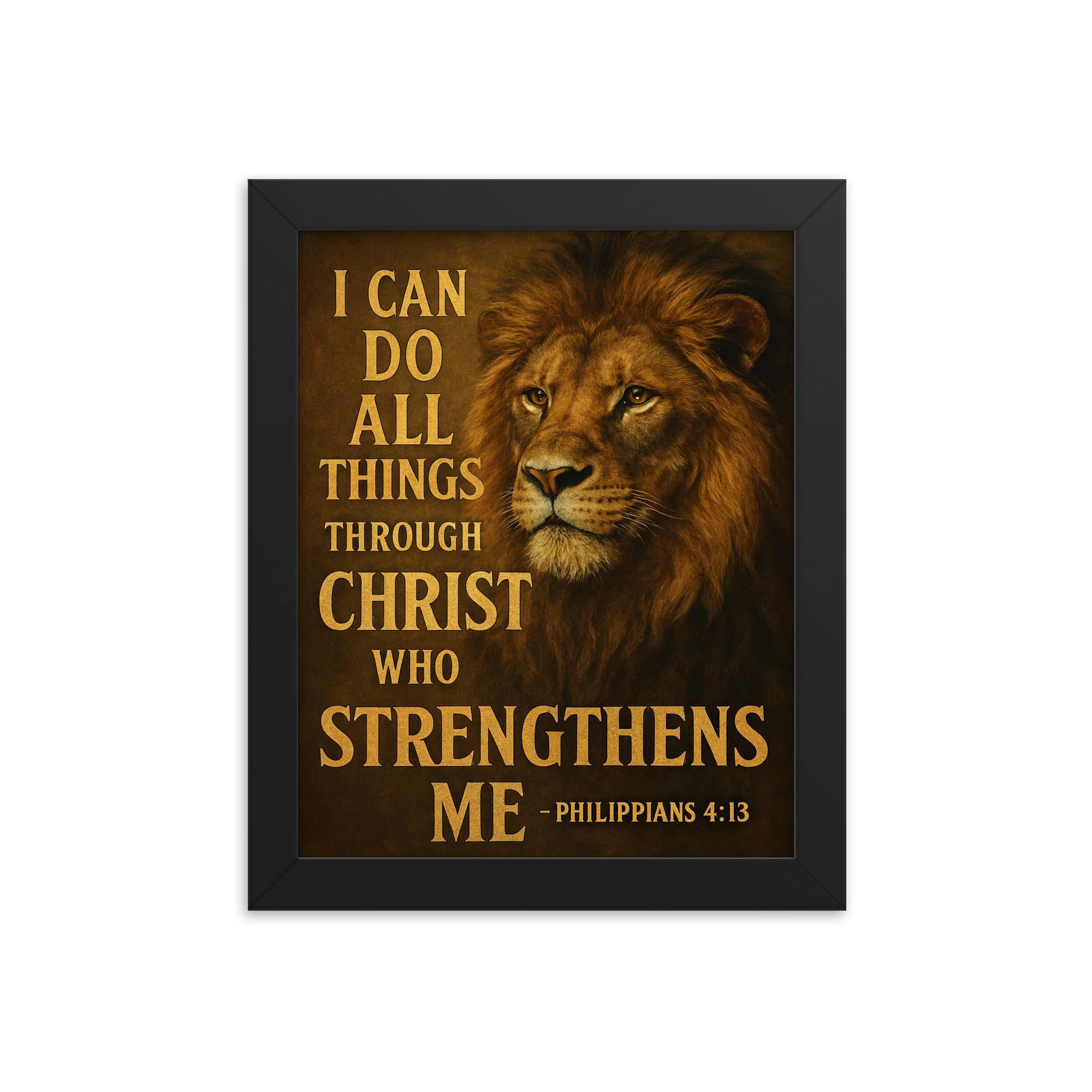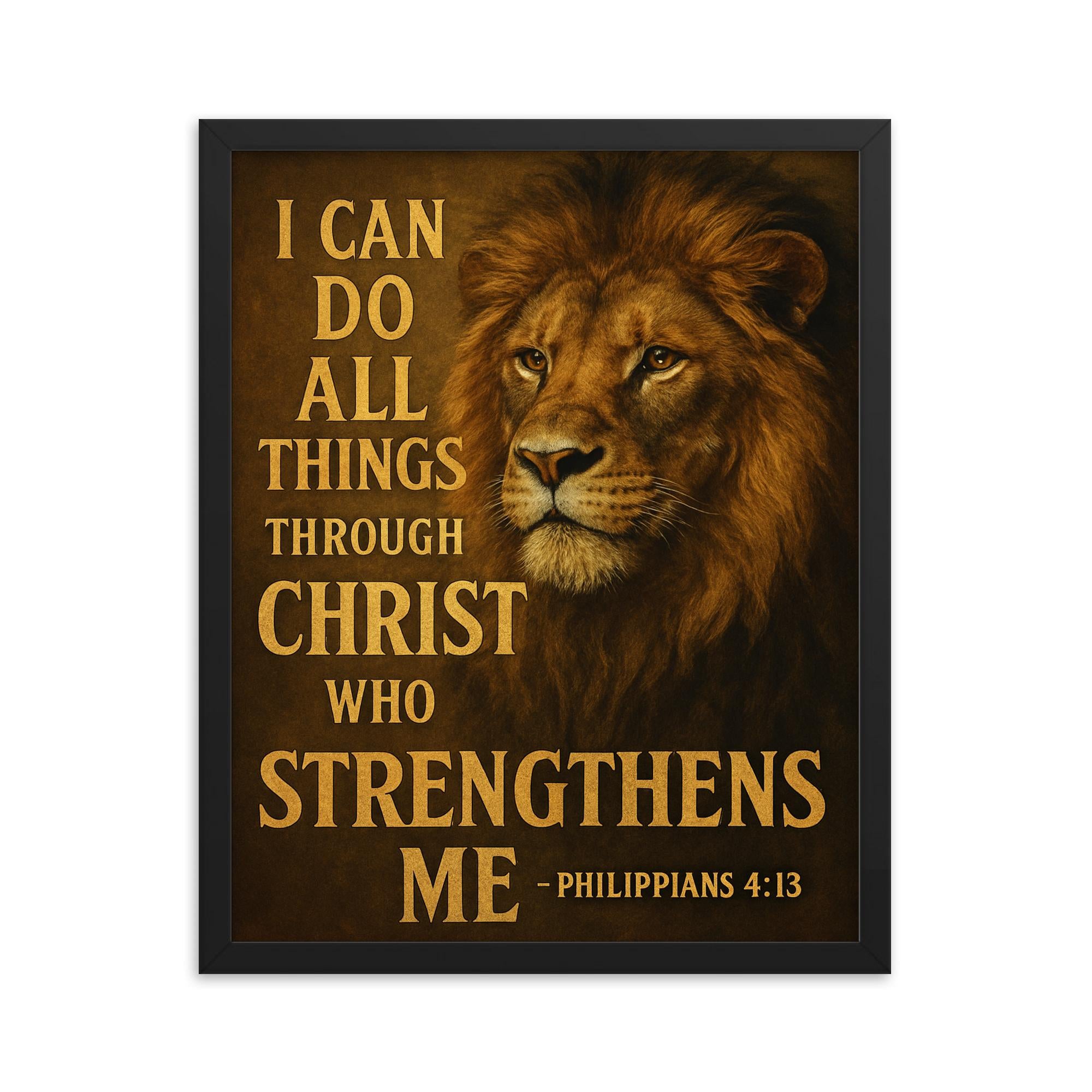 Elevate your space with this powerful framed print featuring the inspiring scripture Philippians 4:13 alongside the commanding face of a majestic lion.