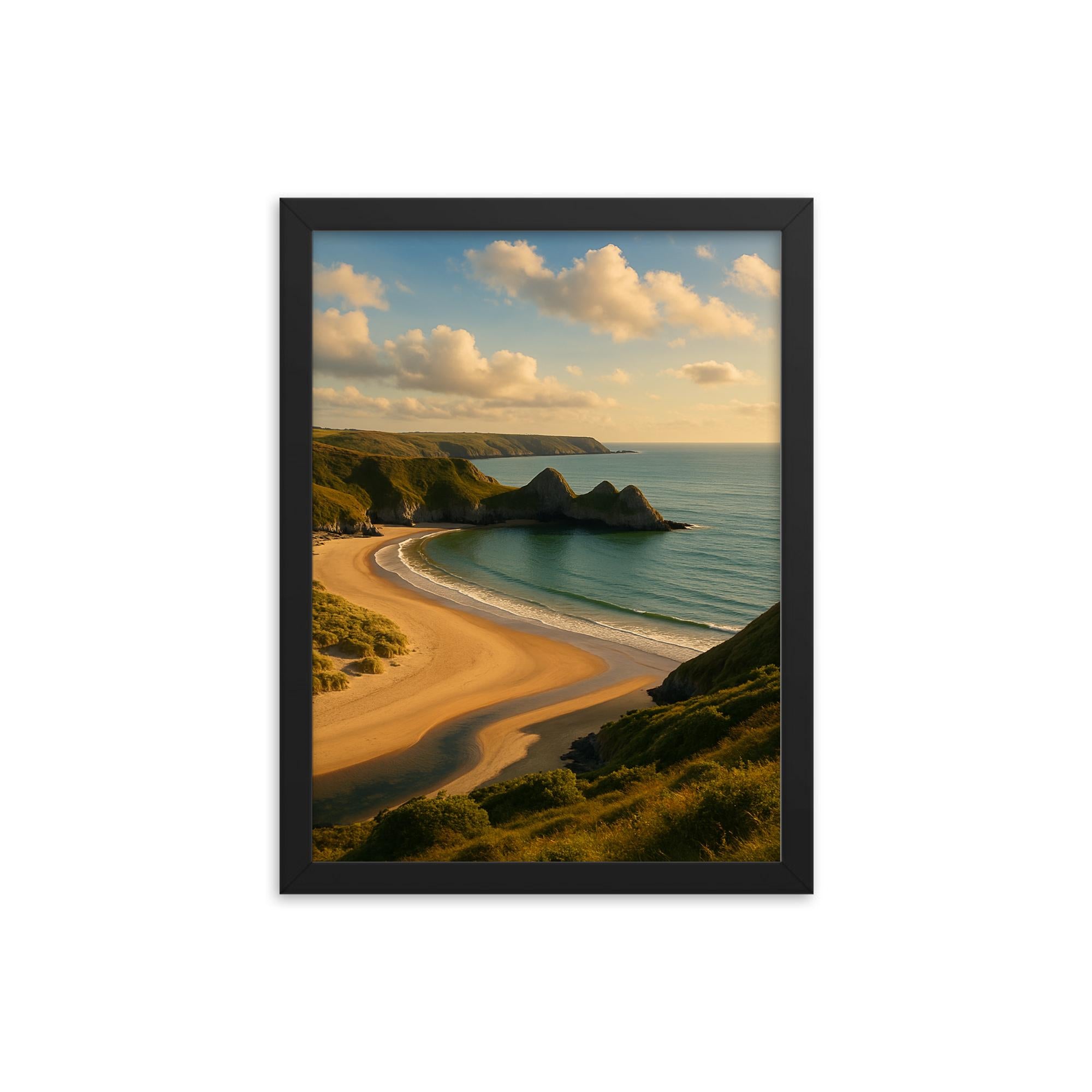 Discover the serene beauty of Three Cliffs Bay, Gower, Wales, captured in this stunning framed print—an exquisite addition to your home or office wall art collection.