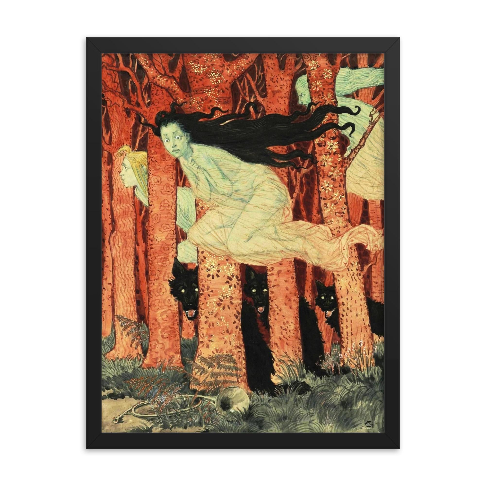 Step into the enchanting world of art nouveau with the framed print of "Three Witches and Three Wolves by Eugene Grasset, 1900"—a captivating piece that effortlessly commands attention and intrigue.