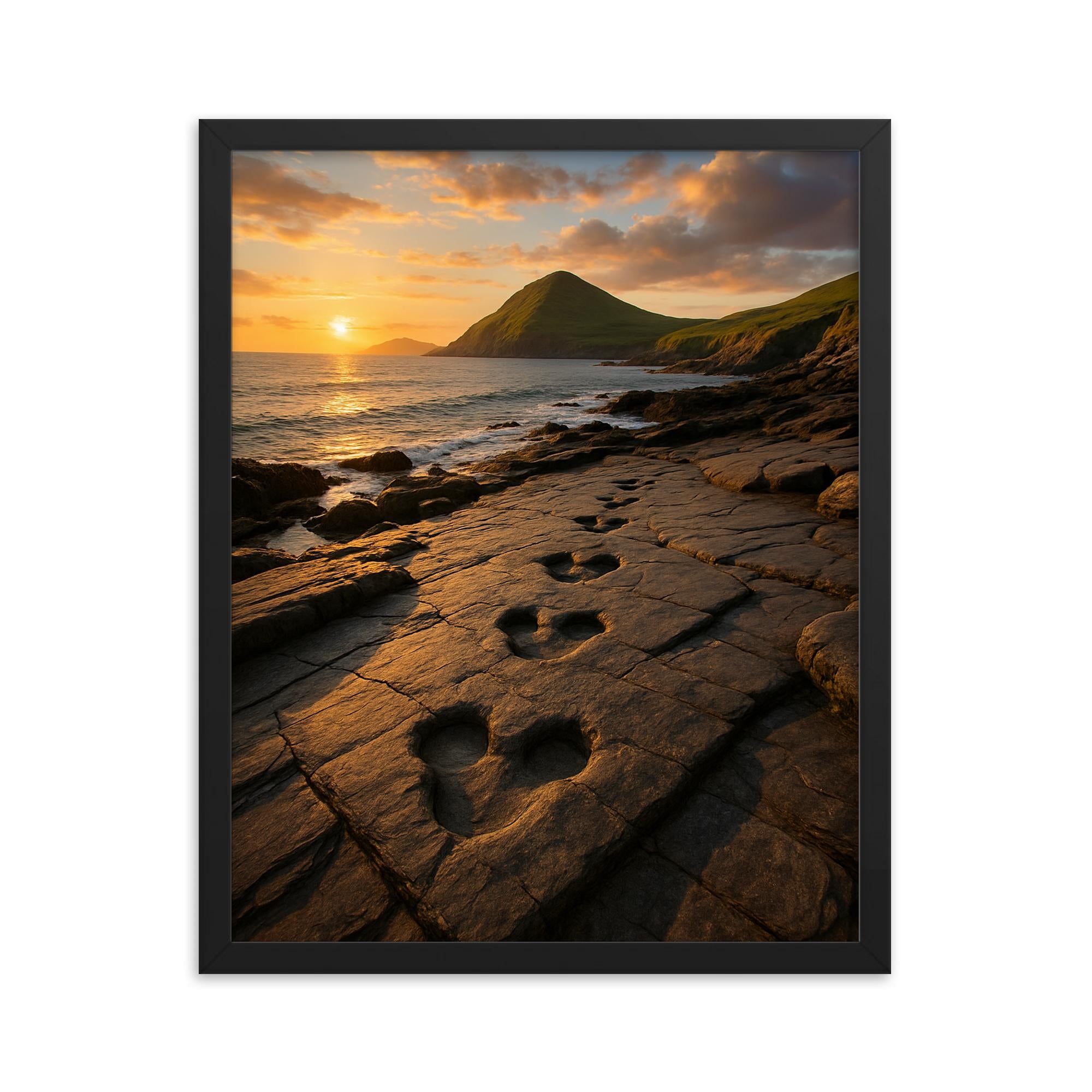 Expertly printed on high-quality material, this framed print showcases the rare and fascinating tetrapod footprints from Valentia Island, an iconic site that draws the attention of nature lovers, history enthusiasts, and art collectors alike.