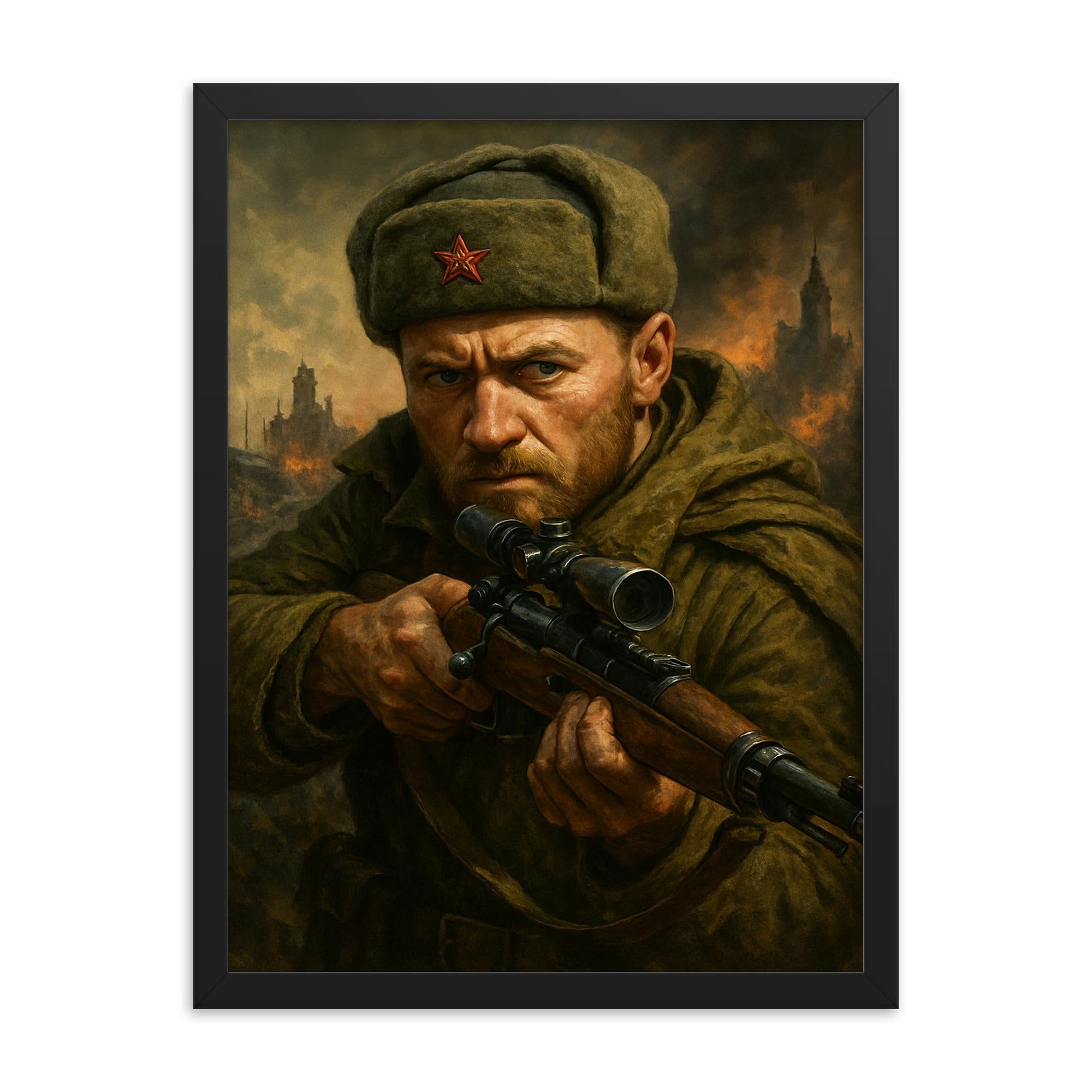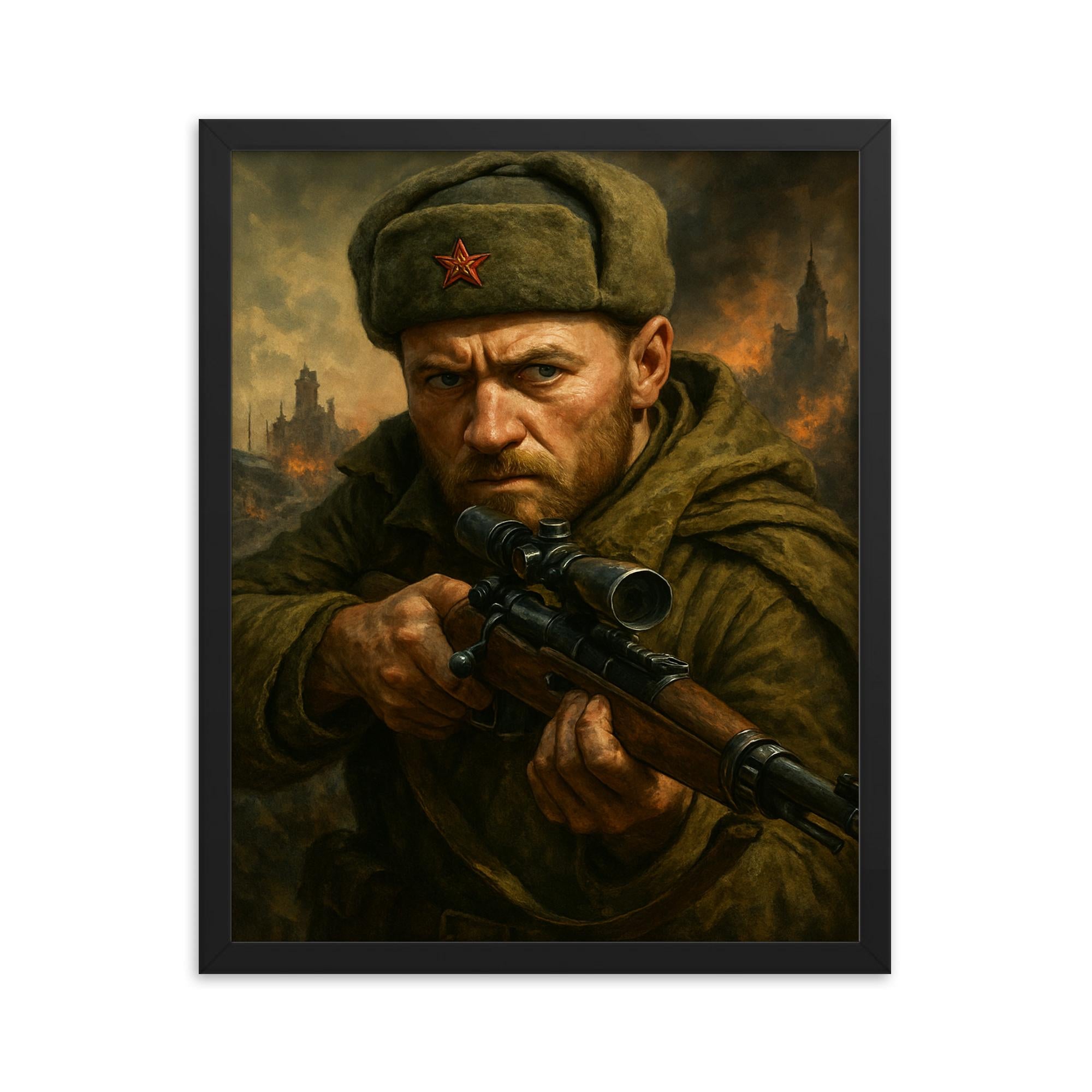 Elevate your space with the striking framed print of Vasily Zaitsev, a powerful piece of wall art that commands attention and inspires conversation.