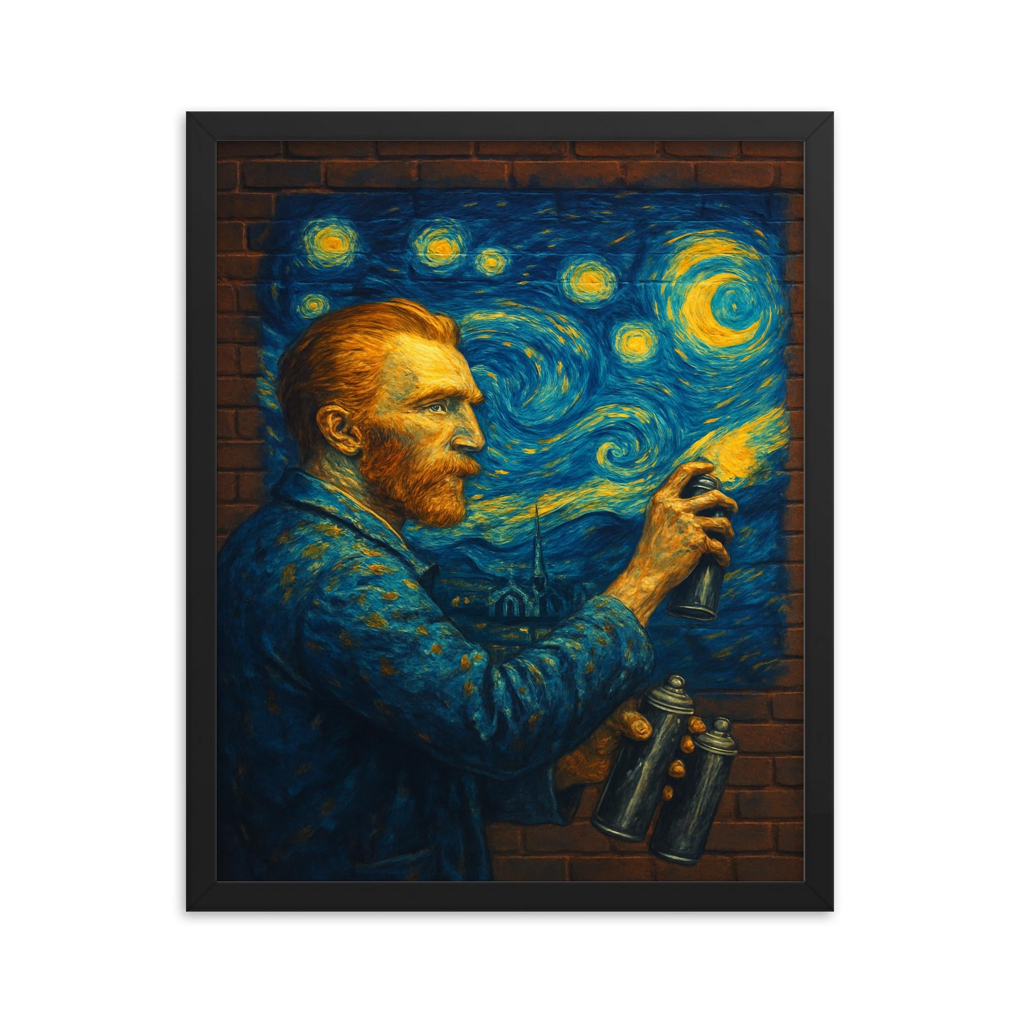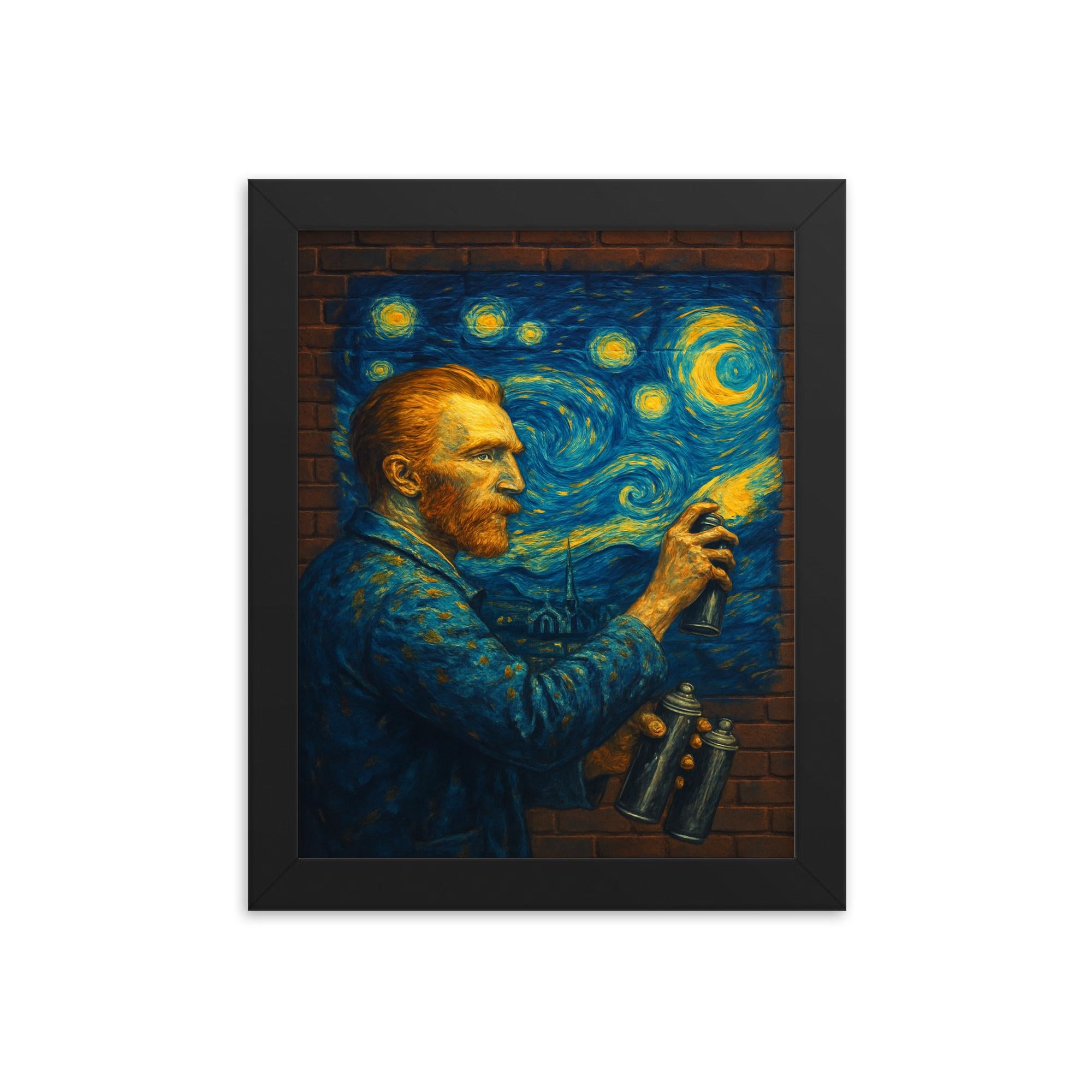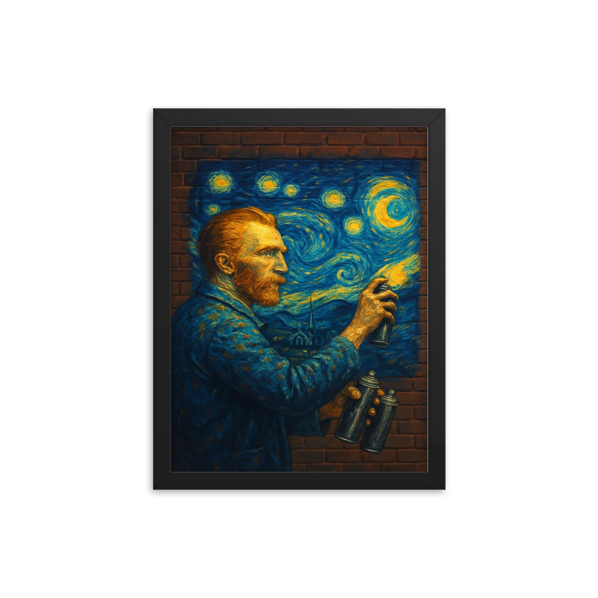 Transform your space with this striking framed print of the iconic Vincent van Gogh painting a Starry Night mural using spray cans on a brick wall—a bold fusion of classic artistry and modern street art.