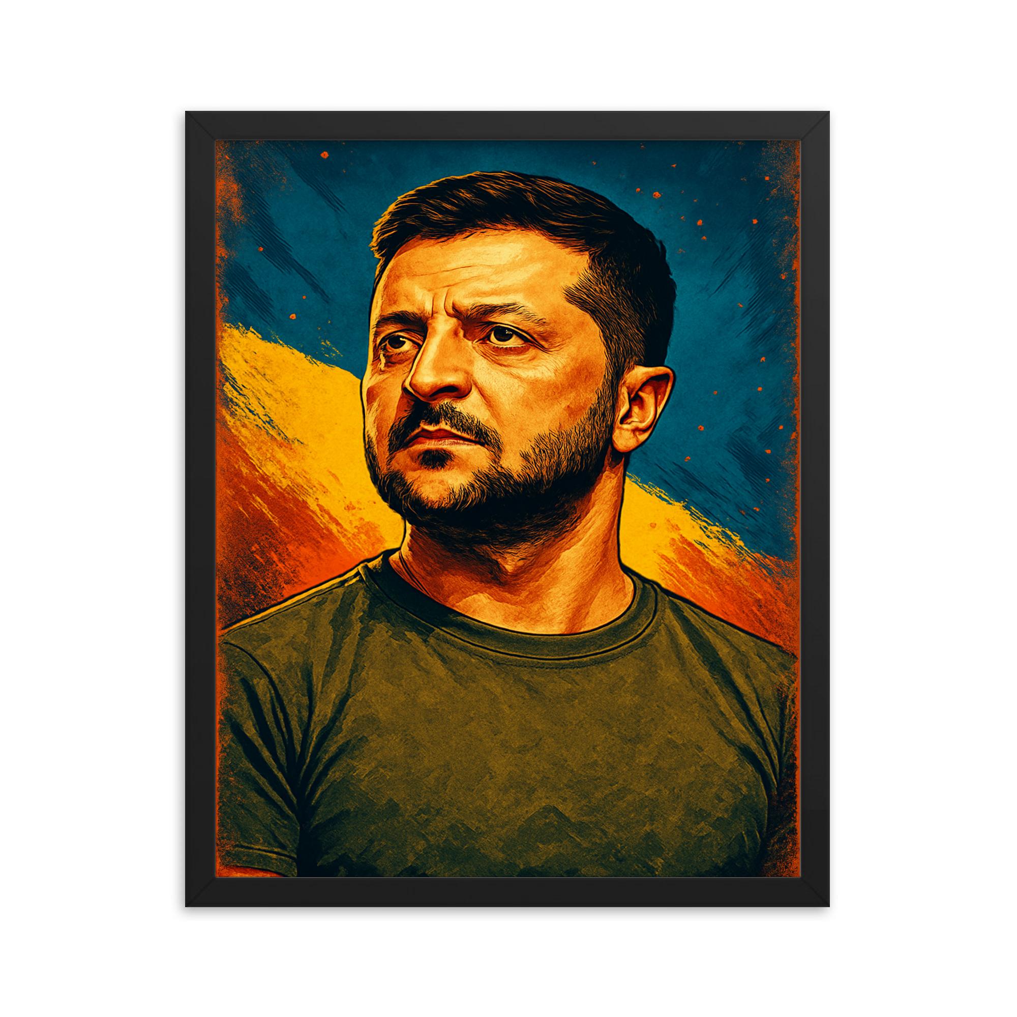 Elevate your space with this striking framed print of Volodymyr Zelenskyy—a powerful tribute to leadership and resilience that speaks volumes on any wall.