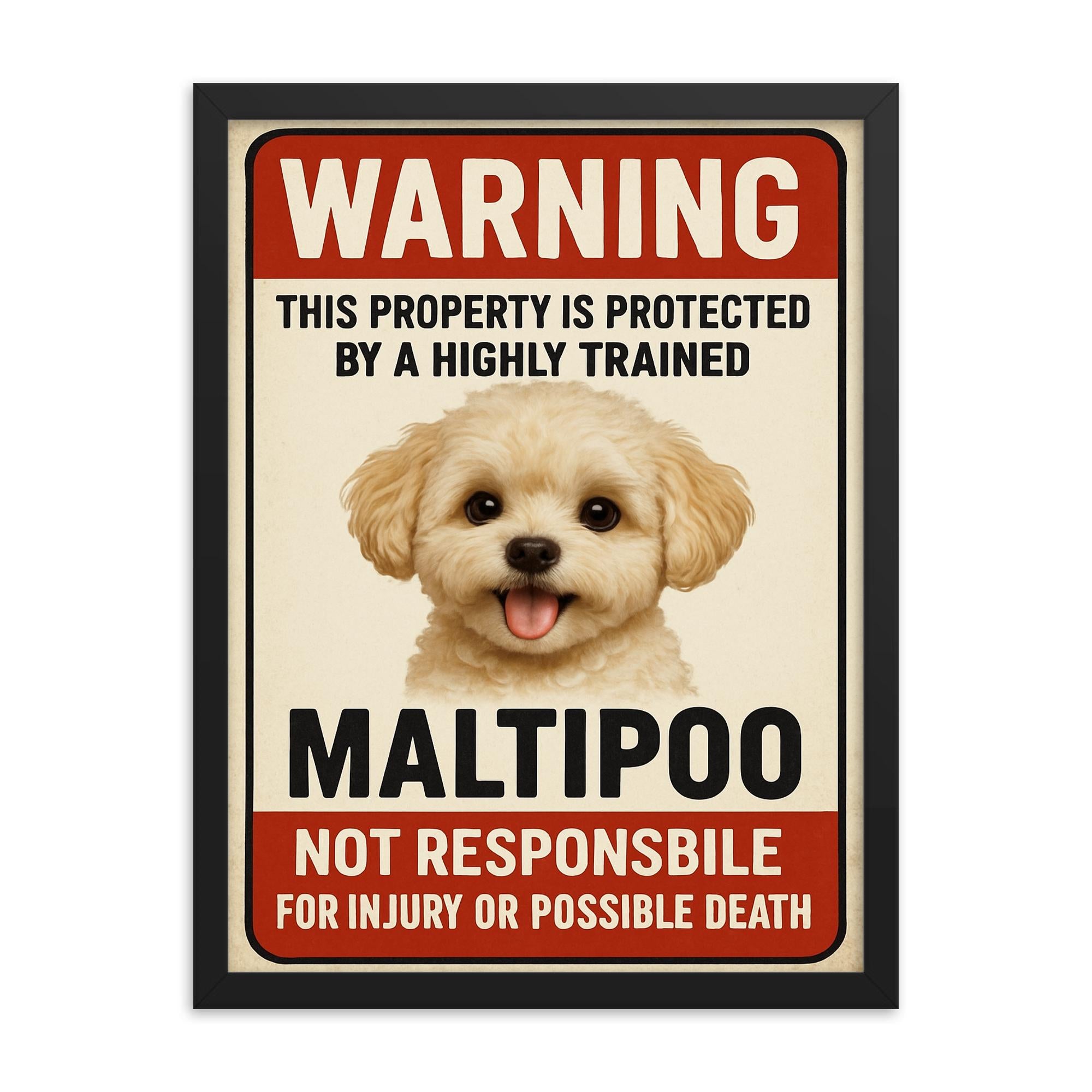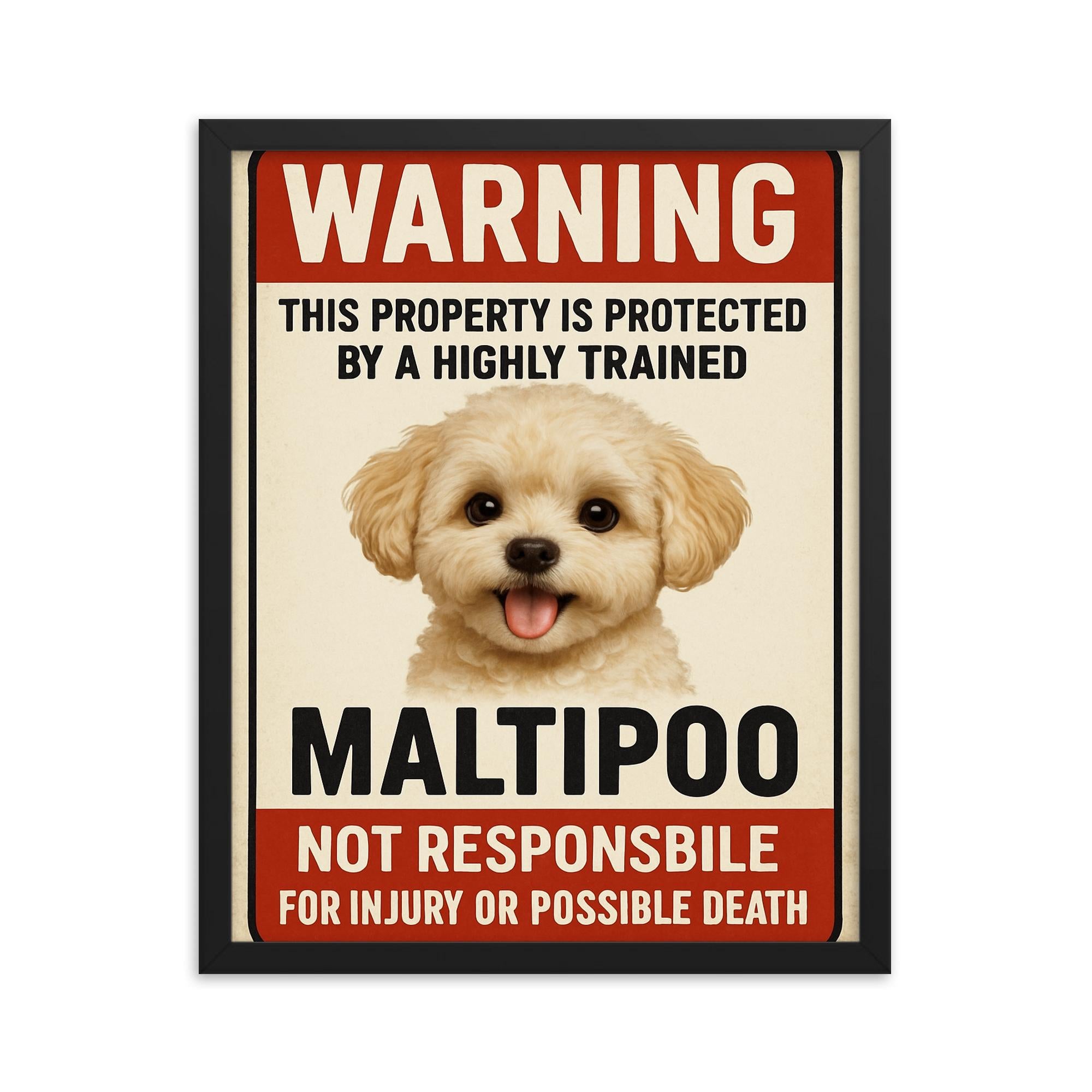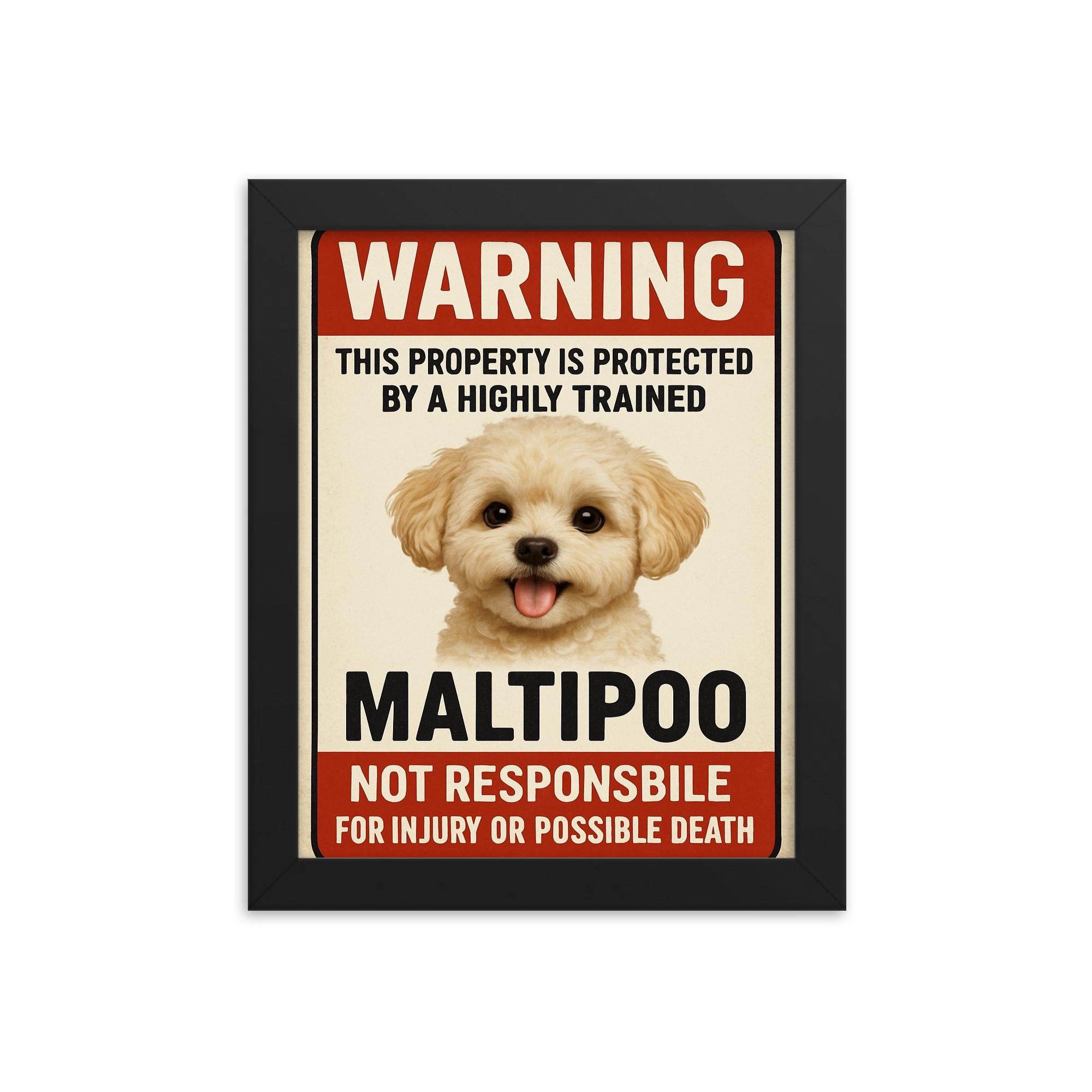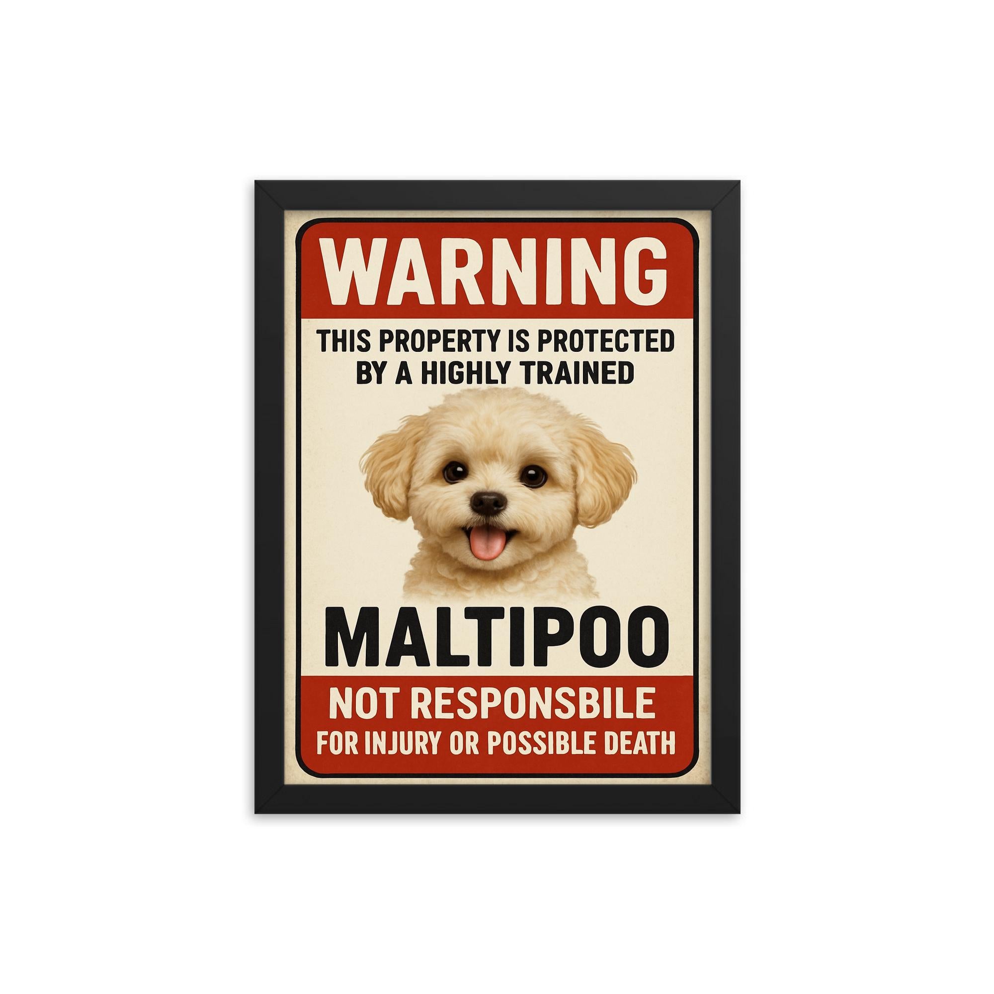 Elevate your home or office décor with this charming framed print – a playful yet proud declaration that your property is guarded by a highly trained Maltipoo.