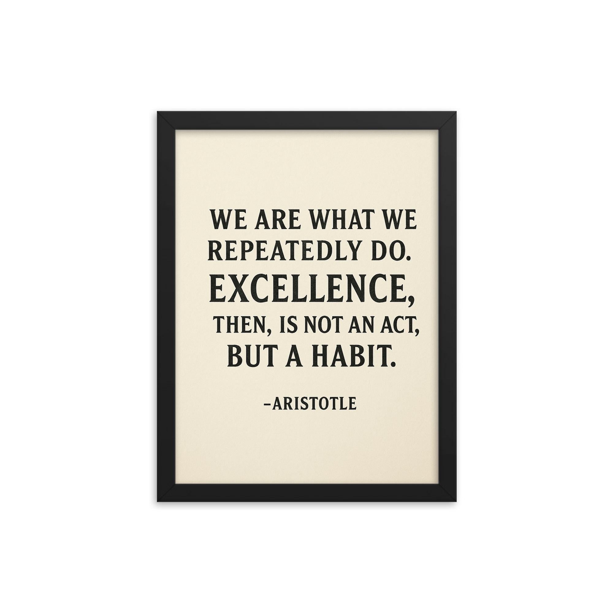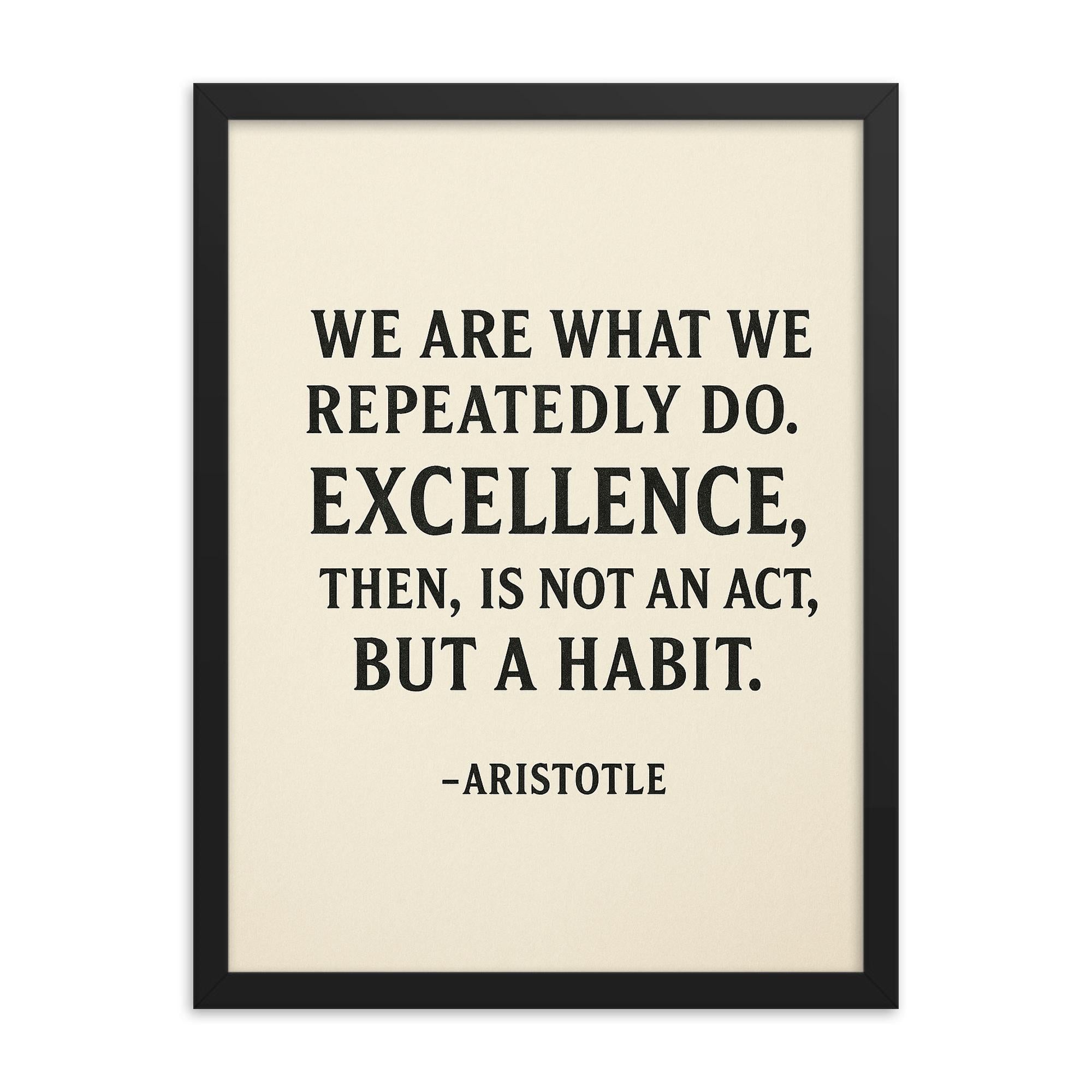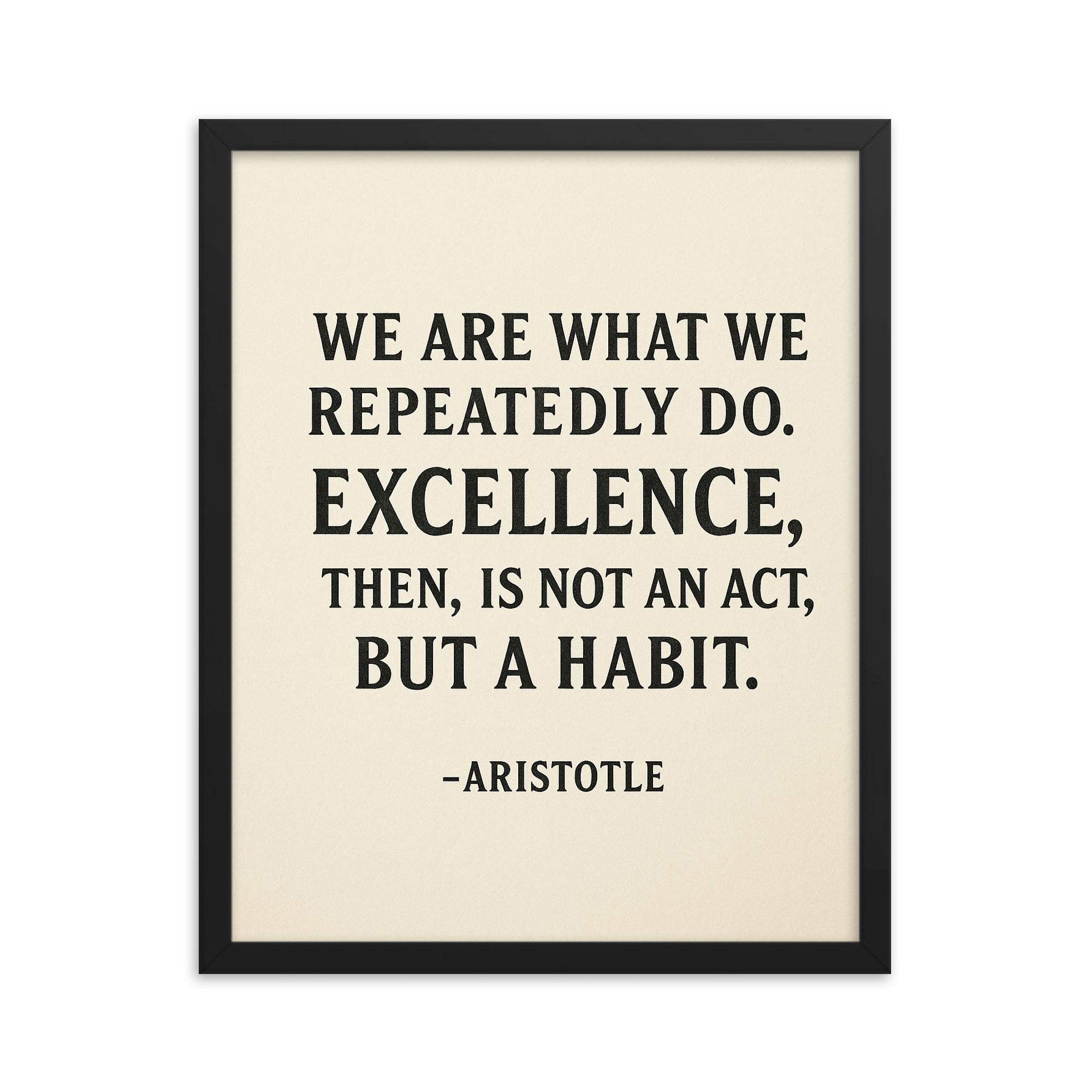 Transform your space and mindset with this stunning framed wall art featuring the legendary words of Aristotle: We are what we repeatedly do. Excellence, then, is not an act, but a habit.