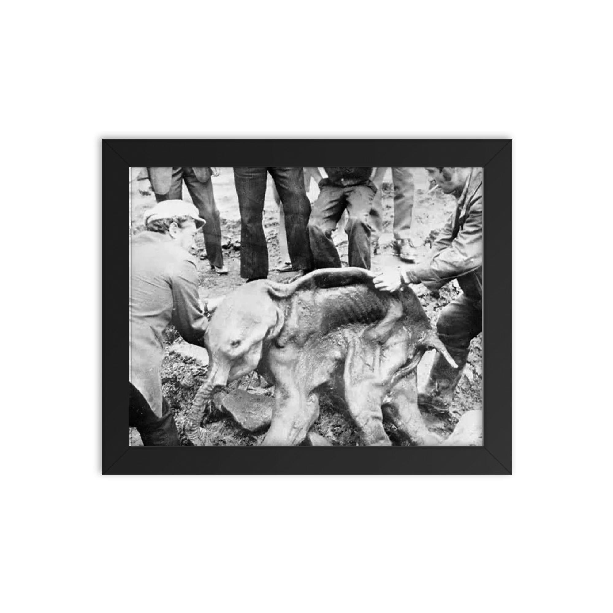 Framed Wall Art of Well Preserved Baby Woolly Mammoth Calf Dima 1977 – Rare Prehistoric Fossil Print for Unique Home Decor