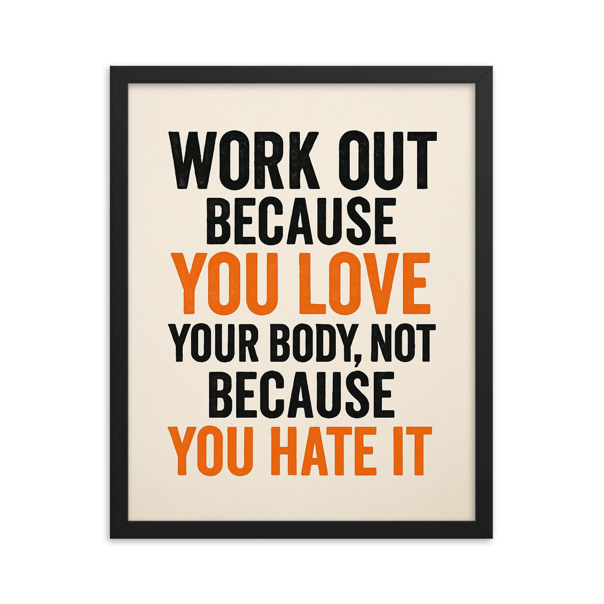 Elevate your fitness motivation and home décor with this inspiring framed print featuring the empowering mantra: Work out because you love your body not because you hate it.