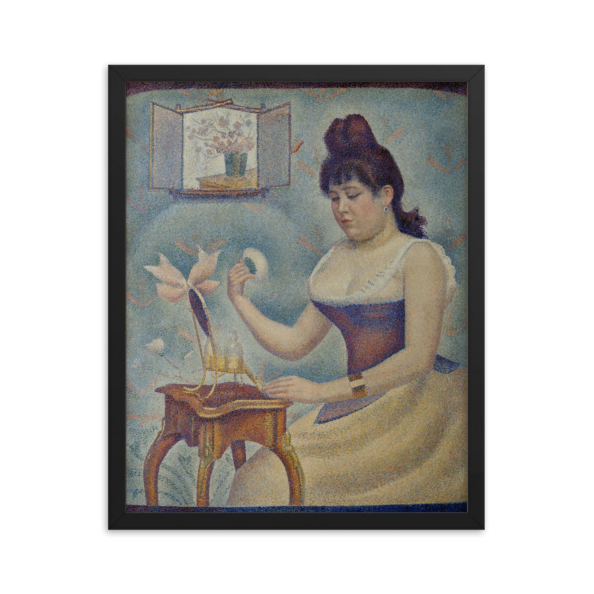 Elevate your space with timeless elegance through this framed print of Georges Seurat’s “Young Woman Powdering Herself.”